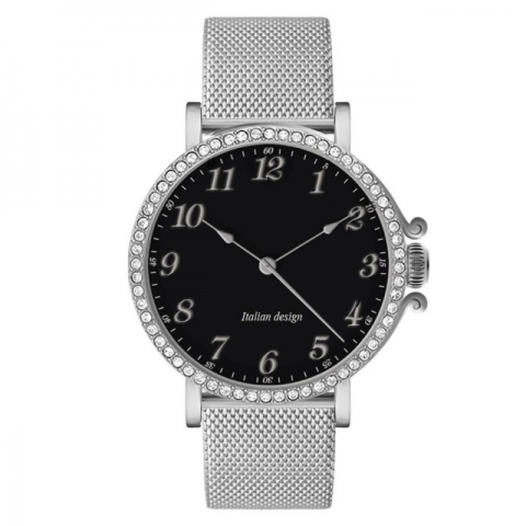 Orologio Boccadamo serie Prince con quadrante circolare nero, indici silver in numeri arabi, cinturino in acciaio maglia Milano silver e ghiera di cristalli Swarovski crystal. Scheda tecnica: - Cassa e fondello: metallo e acciaio. - Larghezza cinturino: 18 mm in acciaio. - Lunghezza cinturino: 24 cm. - Diametro cassa: 37 mm. - Vetro: minerale. - Movimento: al quarzo Seiko. - Impermeabile all'acqua. Orologio Boccadamo completo di astuccio, libretto di istruzioni e certificato di garanzia valida 2 anni presso qualsiasi centro assistenza autorizzato.