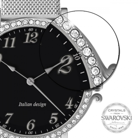 Orologio Boccadamo serie Princess con cinturino maglia Milano silver, quadrante nero e ghiera di Swarovski
