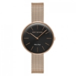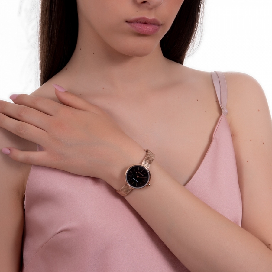 Orologio da polso da donna con quadrante circolare nero, indici placcati oro rosa, cinturino in acciaio maglia mesh placcato oro rosa.