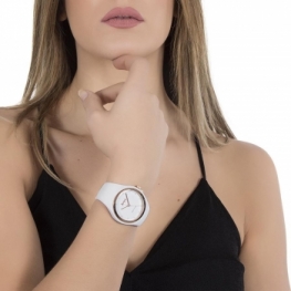 Orologio da polso da donna in silicone anallergico bianco, ghiera rosata, quadrante bianco con indici e lancette rosate.
