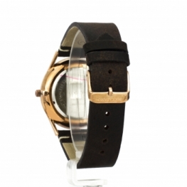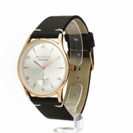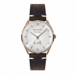 Orologio da polso vintage con quadrante argentato, contasecondi, ghiera placcata oro rosa e cinturino Made in Italy in vera pelle marrone dall'effetto invecchiato.